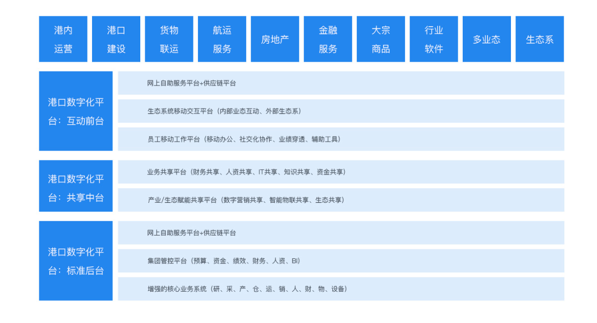 以蒼穹平臺為依托,融合門戶、財(cái)務(wù)管理、資金管理、預(yù)算管理、供應(yīng)鏈管理、人力資源管理等諸多管理系統(tǒng),原生開發(fā)港口生產(chǎn)作業(yè)和調(diào)度系統(tǒng),構(gòu)建智慧港口中臺,助力港口物流數(shù)字化轉(zhuǎn)型